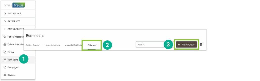 1. Open Trellis and expand the Engagement Section. Click on Reminders in the sidebar (this is where new patients can be added and shared with multiple engagement features).