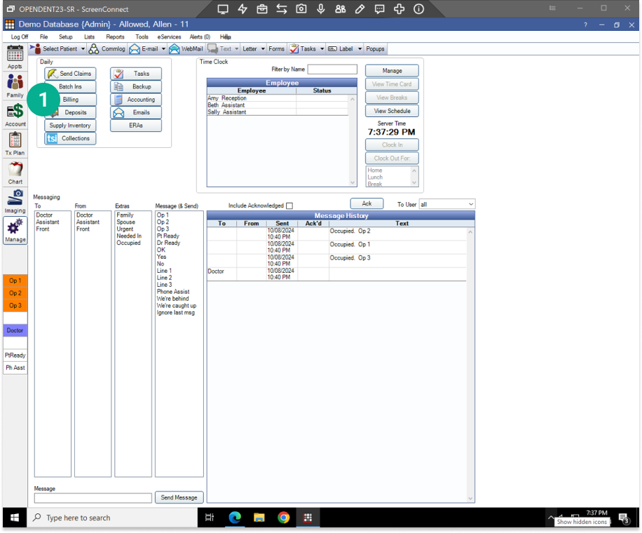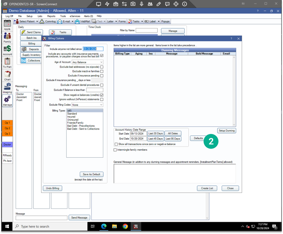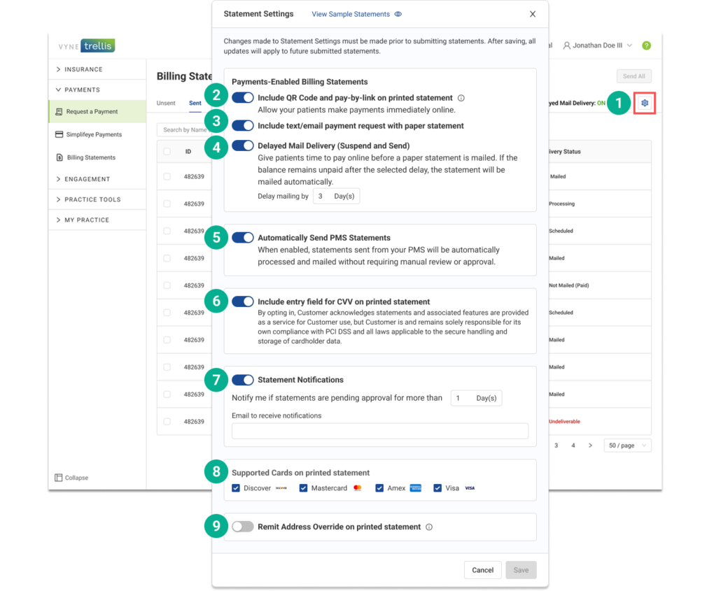 7. Delayed Mail Delivery ON/OFF indicates whether Delayed Mail Delivery is enabled. When turned on, patients have the number of days you select (1-7 days; default 3 days) to pay electronically before a statement is mailed.