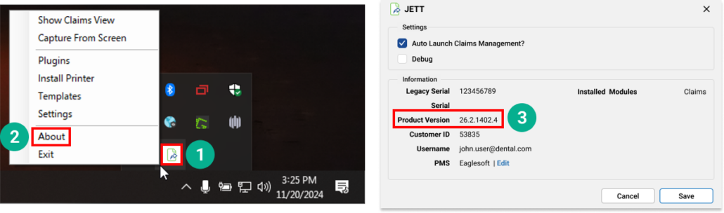 If your version is below Version 25.11, update your plugin by visiting your Downloads page. The JETT Plugin is required on all computers where users initiate sending transactions, not on your practice server.