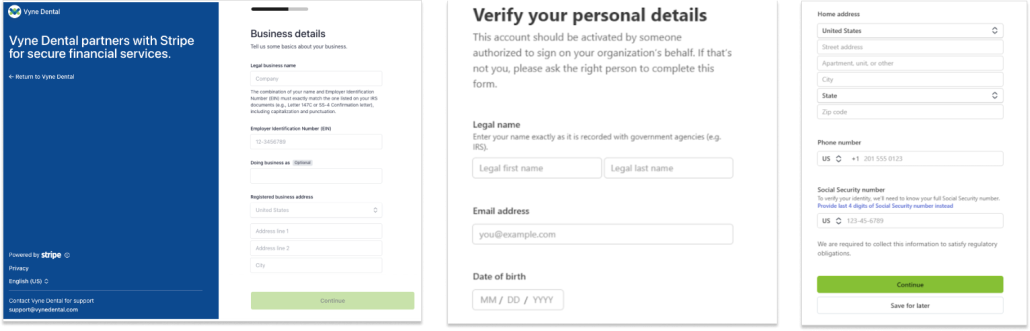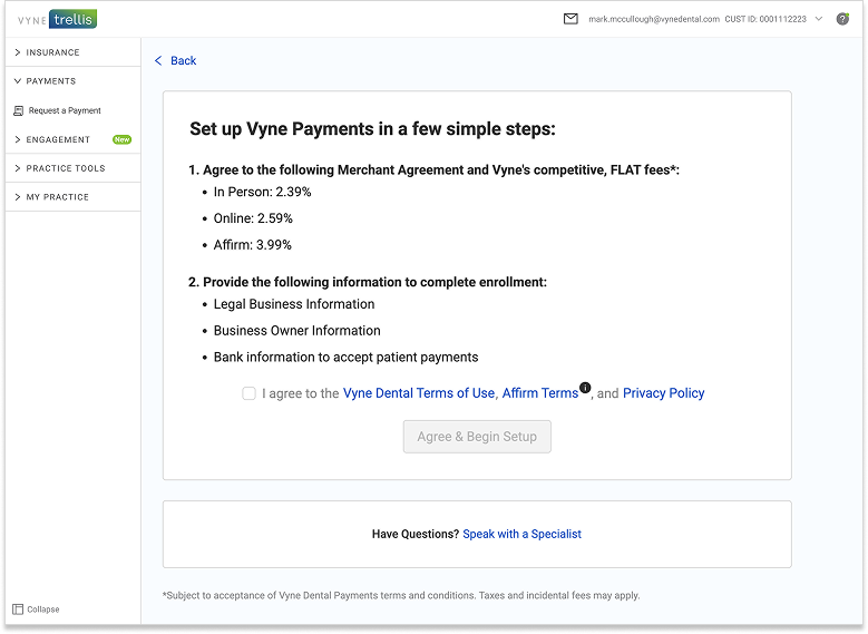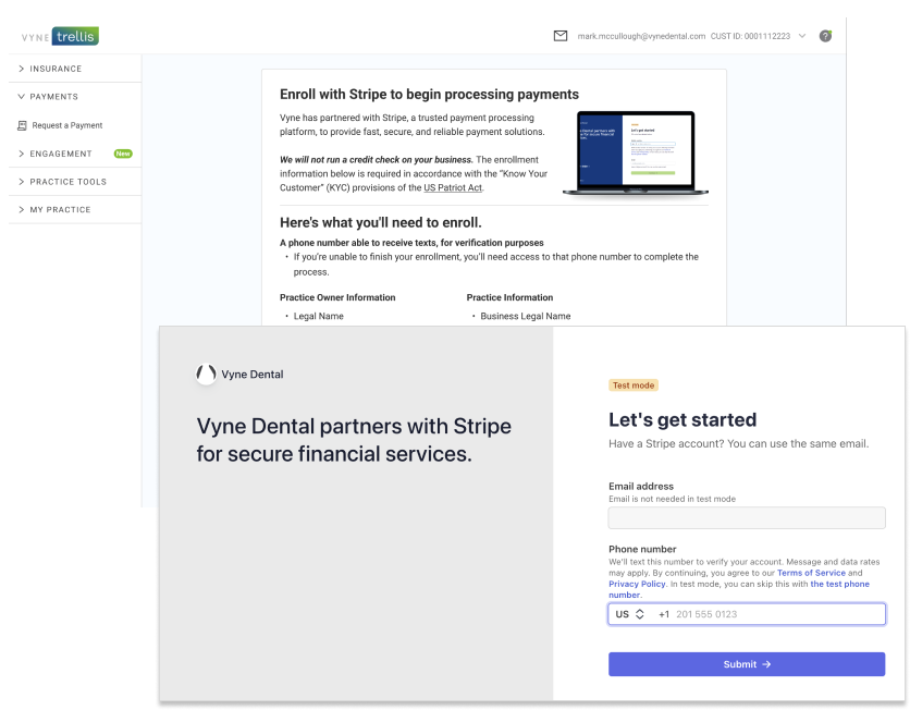 To begin processing payments you first have to set up a merchant account with Vyne’s partner Stripe. To do this we have implemented an easy onboarding process via Stripe. Progress is saved so this process does not need to be done in a single session, however Trellis Payments will be unavailable until the form is complete.