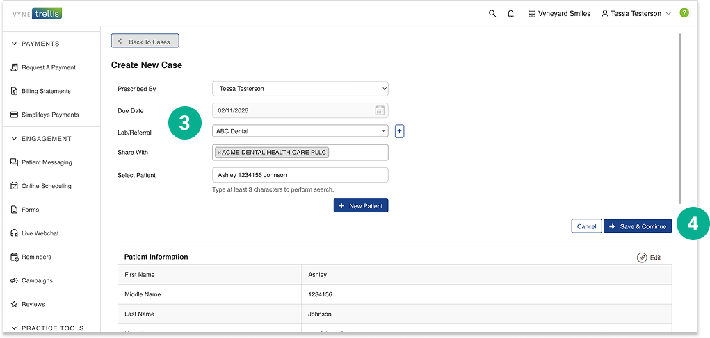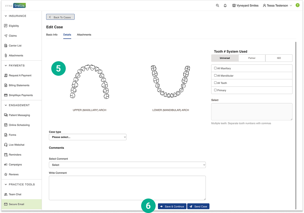 5. Enter the case details, including selection of tooth number(s), case type and comments
