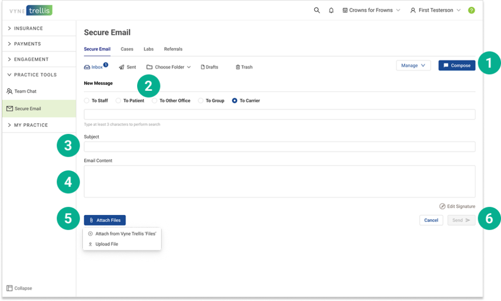 7. To add attachments, click Attach Files. You can attach any files uploaded to Vyne Trellis Files – or select any local files to upload.