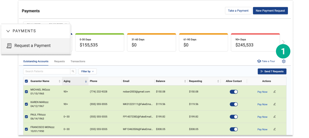 To collect outstanding balances on patient accounts you can quickly and easily send payment requests via text and/or email. Payment requests can either be sent en masse to multiple patients at once or individually to a specific patient.