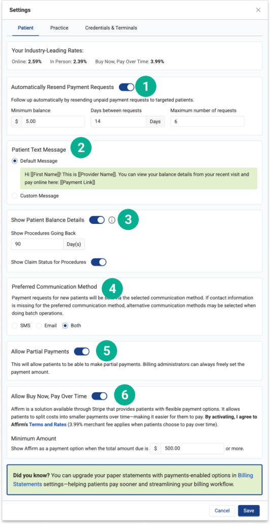 1. Automatically remind patients of Payment requests with Automatic Resend, customized by minimum balance, amount of time between requests, and the maximum number of requests you’d like the patient to receive.