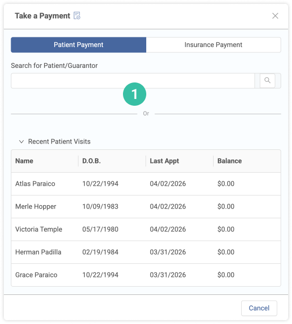 1. Select a patient from the recent visits list or search for a specific patient