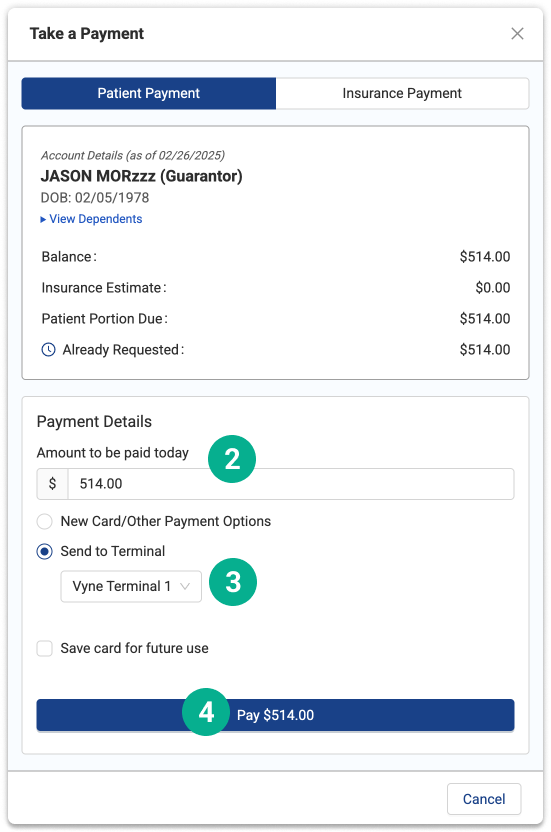 To send a payment request to an existing patient: