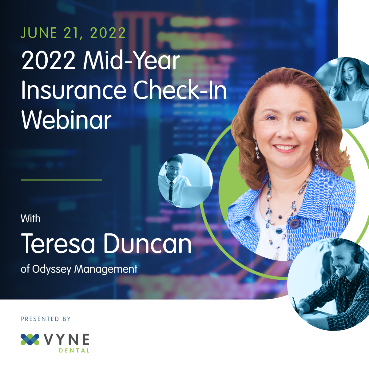 Every January, dental insurance expert and educator Teresa Duncan and Vyne Dental give a seminar highlighting insurance code updates, to prepare dental offices for the year ahead. Now it’s time to touch base with Teresa and one another. Find out what’s changed, what’s new, and what’s coming next in an engaging and informative webinar with the best in the business. On Tuesday June 21, 2022 at 12 CDT/1 EDT, Vyne Dental will host Teresa’s 2022 Mid-Year Insurance Check-In to help you discover what’s going on in the industry right now, and prepare for the 2023 plans coming your way.