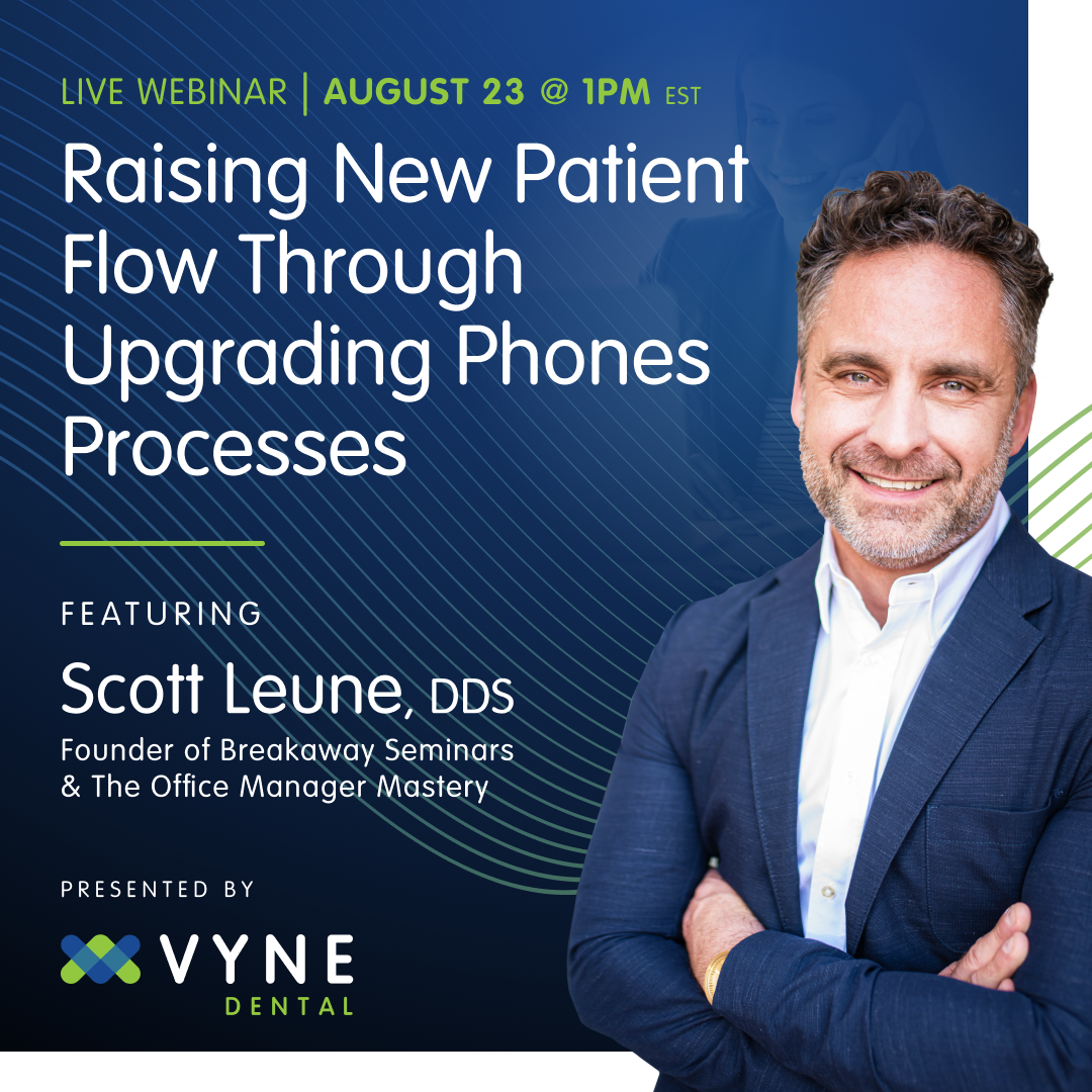 Upgrade your phone process to grow your practice, without investing in time-consuming and expensive marketing campaigns. Join Vyne Dental and Dr. Scott Leune on August 23rd to discover how. Register today.