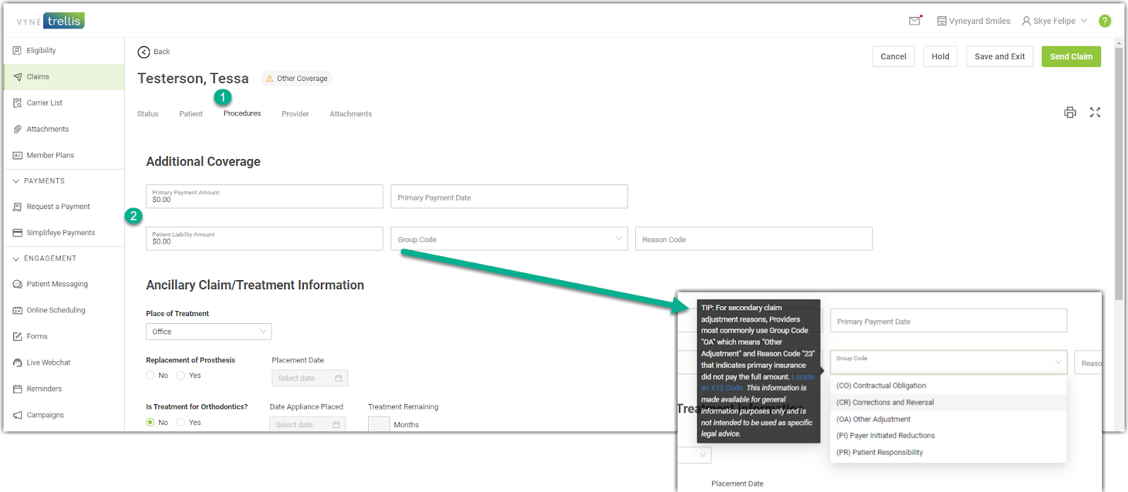 Vyne Dental can help support the successful submission of your secondary claims, to insurance carriers who require adjustment information, by submitting the required information in the Additional Coverage section in the Claim Details Procedure Tab.