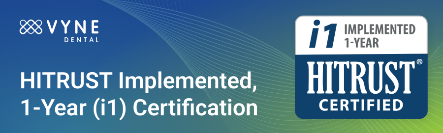 HITRUST Implemented, 1-year (i1) Certification validates Vyne Dental infrastructure is operating within leading security practices to support protection of sensitive information