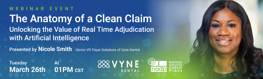 Join us for an insightful webinar, “The Anatomy of a Clean Claim,” presented by Nicole Smith, SVP Payer Solutions of Vyne Dental. In this engaging session, we will delve into the intricacies of an intelligent clearinghouse platform with a focus on leveraging Artificial Intelligence (AI) and other technological advancements to unlock the potential an intelligent clearinghouse can have on real time claims processing and real-time claim adjudication. Register now.
